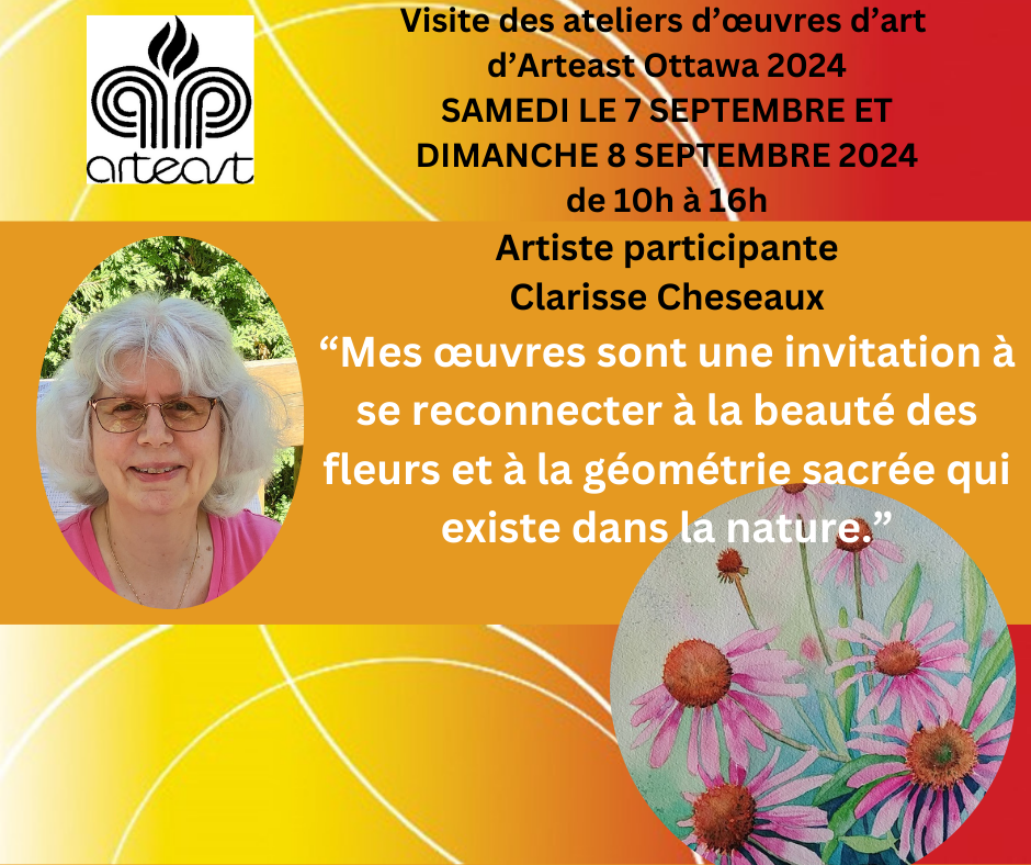 Fine Arts Studio Tour/ Visite des ateliers d’art d’Arteast Ottawa 2024 : samedi 7 septembre et dimanche 8 septembre de 10h à 16h.