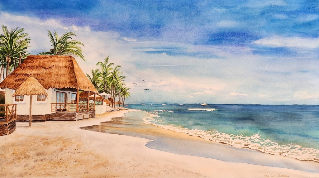 Une commande terminée le 23 mai 2024: « Souvenir d’une plage au Mexique« . 15X26 Un supper défi que j’ai beaucoup aimé peindre!